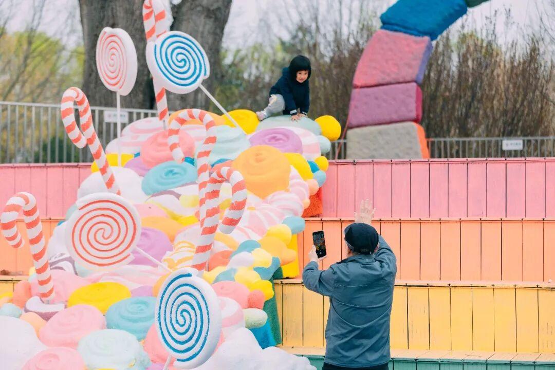 走进园内,长达24米的BlingBling彩虹长廊喜迎游客。闪亮的彩虹纱幔层层垂落,光影交错间营造出璀璨质感,如同走进糖果包裹的梦幻隧道。旋转木马被糖果泡雕、彩色绸布与童趣装饰包裹,木马转动时仿佛驶入糖果星河。彩虹阶梯营造出糖果瀑布视觉效果,成为游客拍照打卡的热门点位。热气球森林里,各色卡通热气球错落布置于翠绿草坪之上,勾勒出一幅浪漫又治愈的童话画卷。糖果树、巧克力小镇、棉花糖云海等点位更是一步一景,随手一拍便是春日里的甜蜜大片。