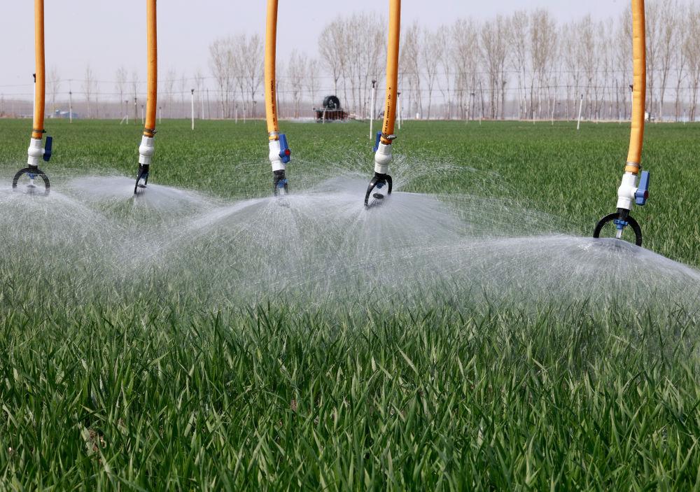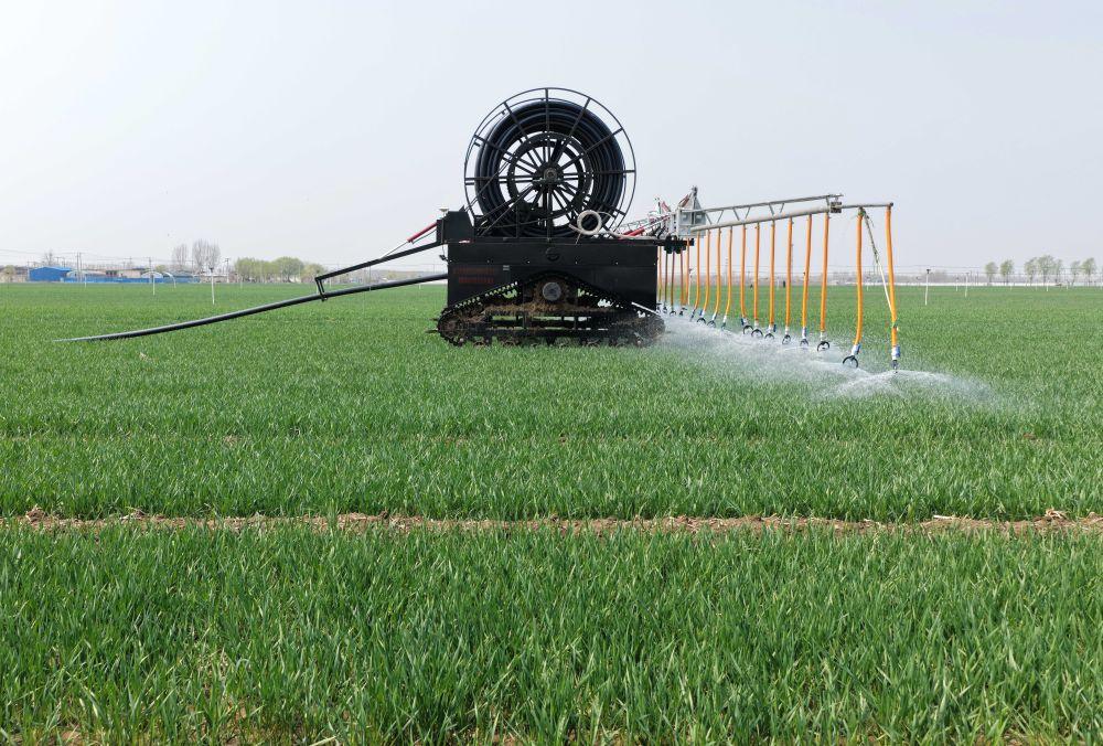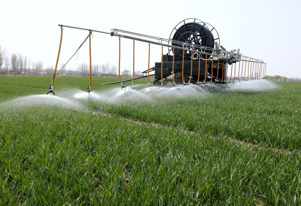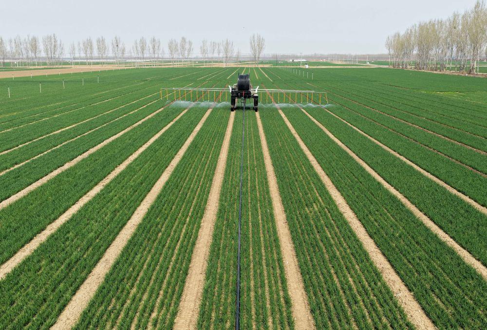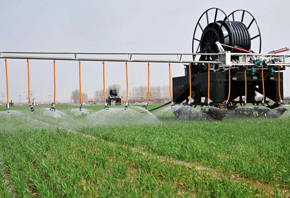 ↑4月2日,自走式水肥一体农田喷灌设备在河北省唐山市丰南区大新庄镇的冬小麦田间进行喷灌作业。