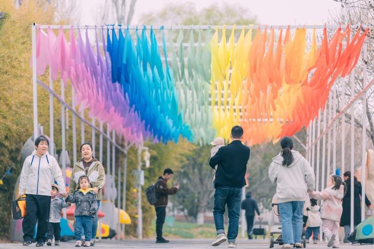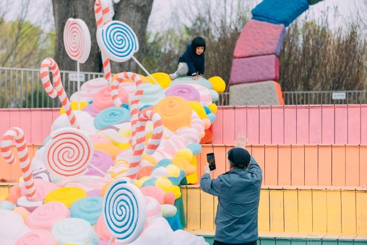 走进园内,长达24米的闪闪发光的彩虹长廊喜迎游客。闪亮的彩虹纱幔层层垂落,光影交错间营造出璀璨质感,如同走进糖果包裹的梦幻隧道。旋转木马被糖果泡雕、彩色绸布与童趣装饰包裹,木马转动时仿佛驶入糖果星河。彩虹阶梯营造出糖果瀑布视觉效果,成为游客拍照打卡的热门点位。热气球森林里,各色卡通热气球错落分布于翠绿草坪上,勾勒出一幅浪漫又治愈的童话画卷。糖果树、巧克力小镇、棉花糖云海等点位更是一步一景,随手一拍便是春日里的甜蜜大片。