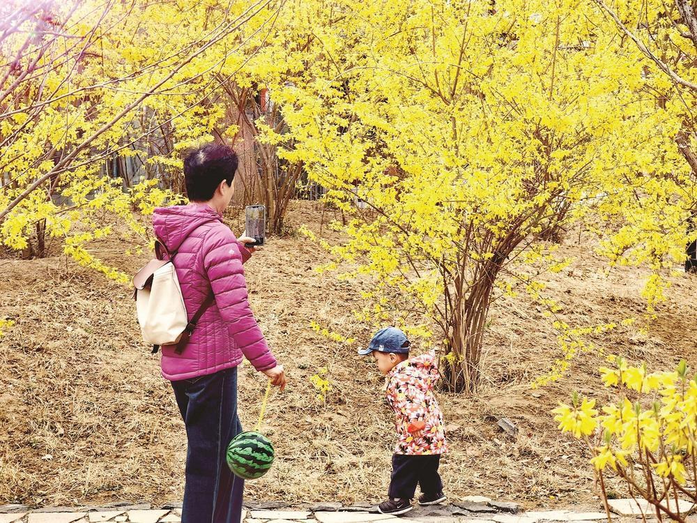 市民在观赏连翘花。记者 杨文进 摄
