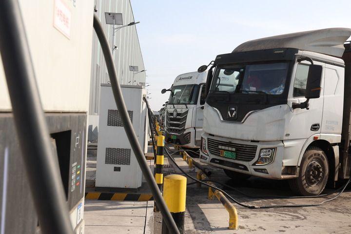 ↑多辆重卡在唐山市曹妃甸工业区的一家充电站内充电。