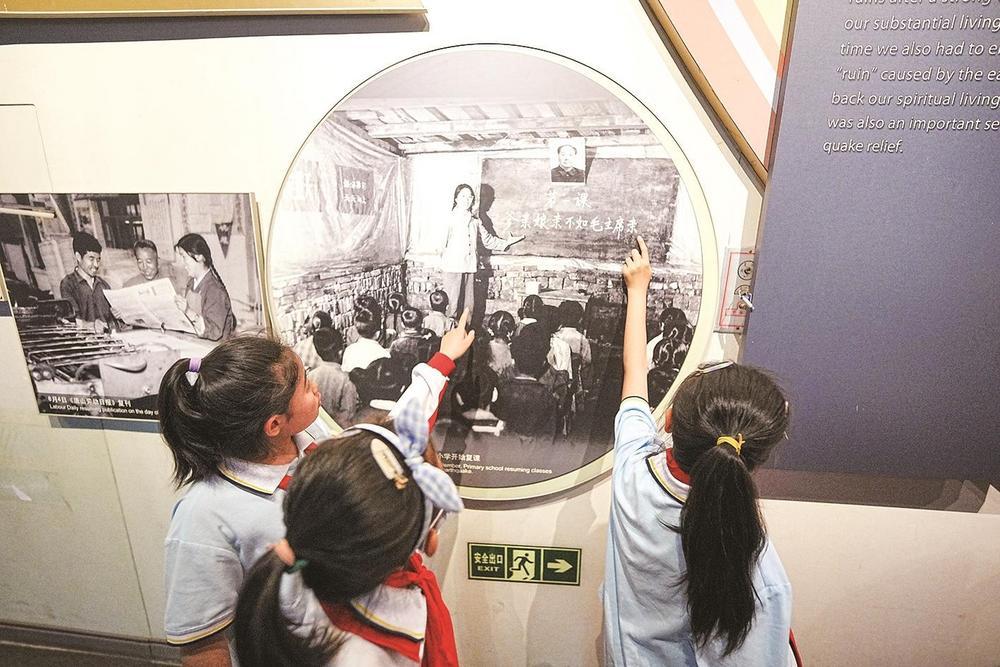 路南区实验小学组织学生在地震遗址纪念公园展馆内参观。(董颖 摄)