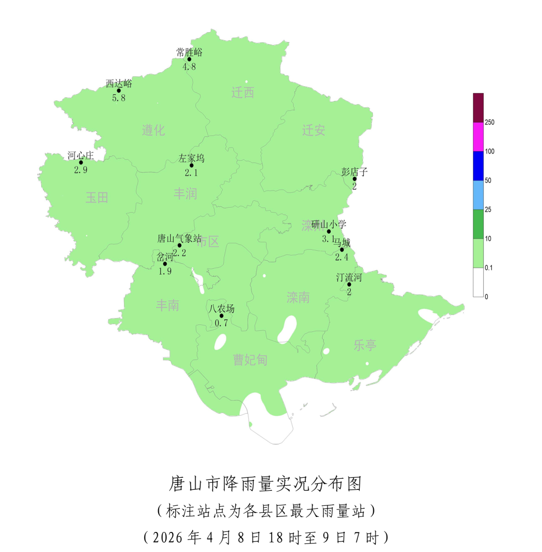 受高空槽影响,8日傍晚到夜间唐山市出现小雨天气,截止到9日7时,降水仍在持续。全市平均降水量为1.5毫米,最大降水量为遵化西达峪5.8毫米。