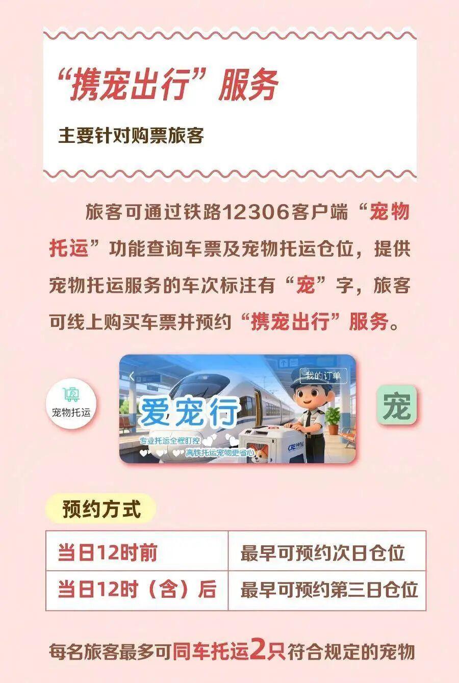 其中,“携宠出行”服务主要针对购票旅客,旅客可通过铁路12306客户端“宠物托运”功能查询车票及宠物托运仓位,提供宠物托运服务的车次标注有“宠”字,旅客可线上购买车票并预约同车宠物托运服务,每日12时前最早可预约次日仓位,12时(含)后最早可预约第三日仓位,每名旅客最多可同车托运2只符合规定的宠物。
