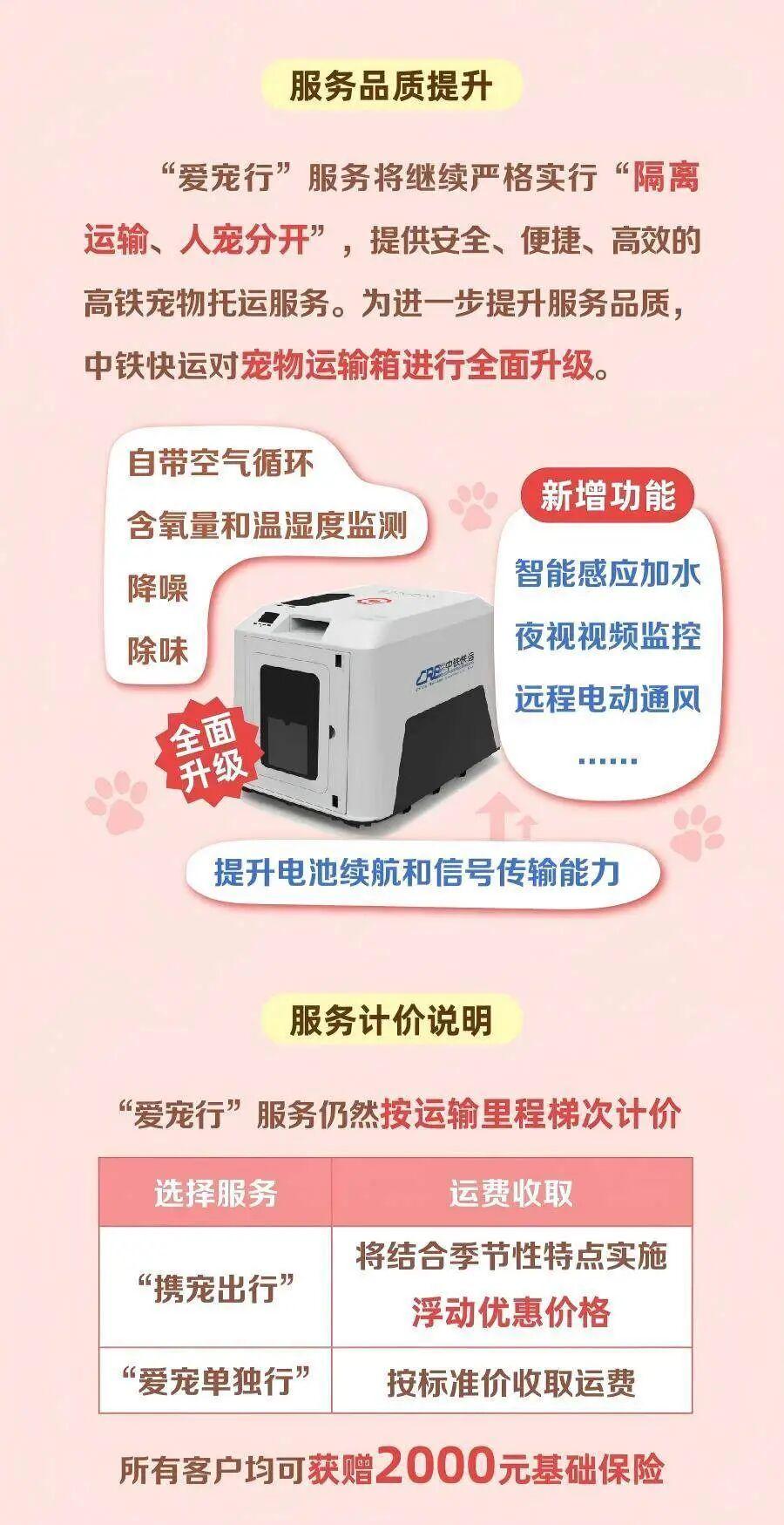“爱宠行”服务将继续严格实行“隔离运输、人宠分开”,提供安全、便捷、高效的高铁宠物托运服务。为进一步提升服务品质,中铁快运对宠物运输箱进行全面升级,在自带空气循环、含氧量和温湿度监测、降噪、除味功能的基础上,新增智能感应加水、夜视视频监控、远程电动通风等功能,提升电池续航和信号传输能力。