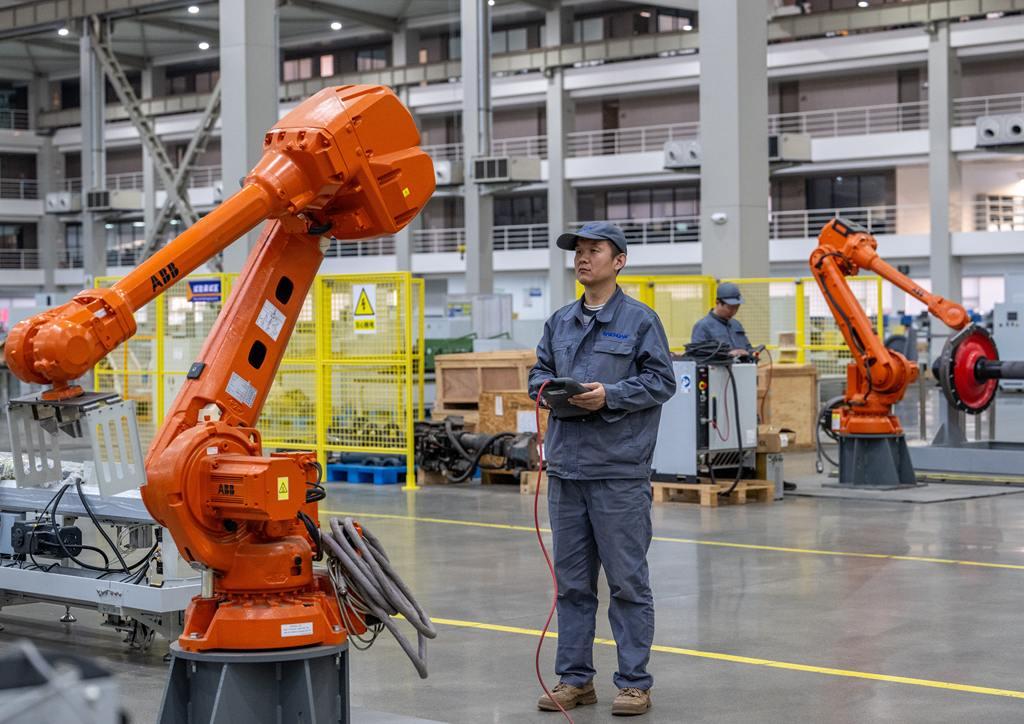 1月6日,唐山百川机器人共享智能制造工厂,技术人员在调试机器人设备。 河北日报记者 赵杰 摄