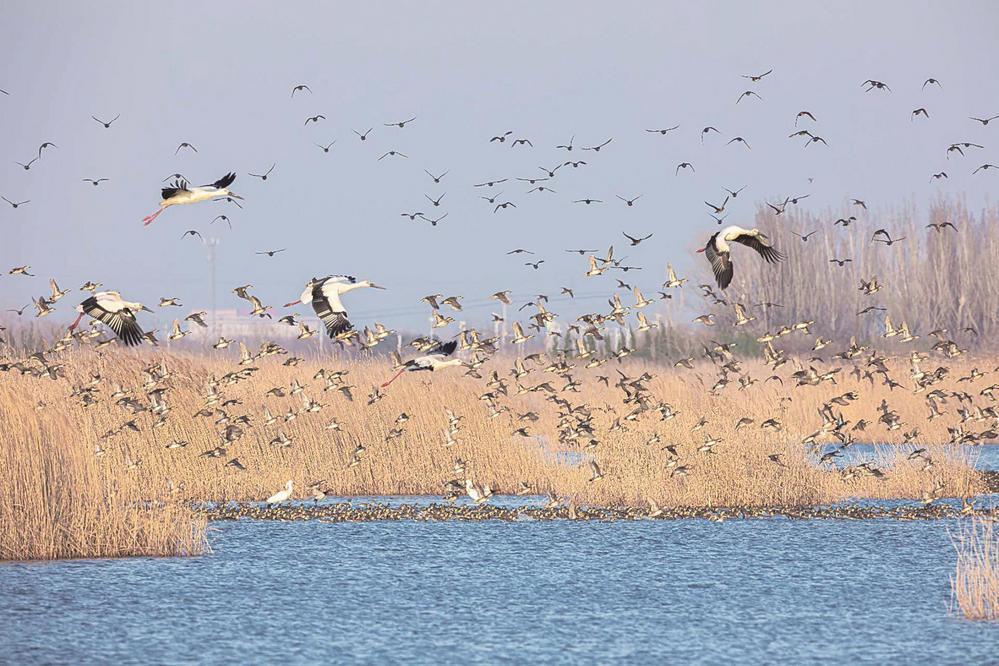 曹妃甸湿地鸟类成群栖息飞翔。霍永生 摄