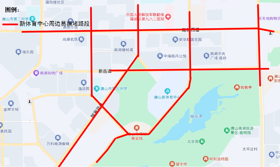 2026年4月25日、26日,在唐山新体育中心体育场将举办南湖音乐节,演出当天通行人员较多,场馆周边道路将面临较大交通压力,预计车流量较大的路段示意图如下。同时由于场馆周边停车泊位有限,建议观众乘坐公共交通工具前往。
