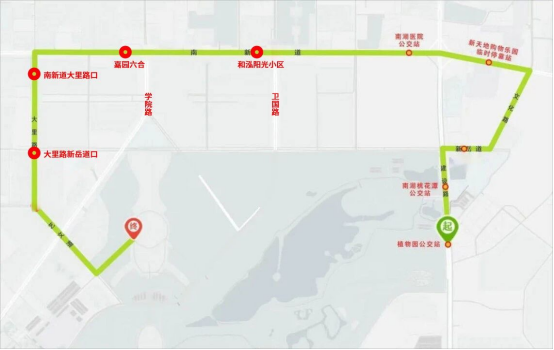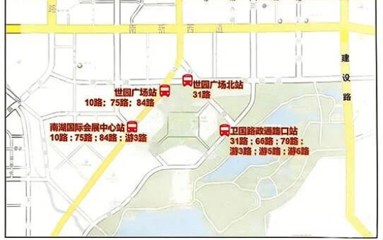 植物园公交站(南湖美食广场停车场)→南湖桃花潭公交站(影视基地停车场)→新天地购物乐园临时停车点→南湖医院公交站(新天地购物乐园、美泰家世界)→和泓阳光小区→嘉园六合小区→南新道大里路口→大里路新岳道口→演出场馆(世园广场临时停车场指定地点)。