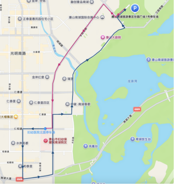 路线(蓝线):妇幼医院北停车场→仁和道→学院南路→艺文道→世园广场停车场指定地点