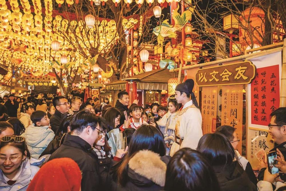 往来游客来自天南地北,不少人诗词功底扎实,诗句接得又快又准。王浩楠摇头晃脑地应战,一来一往间,气氛愈发热烈。围观人群越聚越多,就连街边店铺的工作人员也忍不住驻足观望,整条街巷被诗意与欢乐填满。